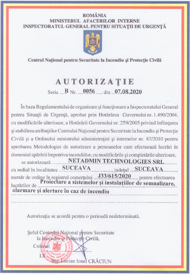 Netadmin Technologies SRL Suceava este autorizata pentru efectuarea lucrarilor de proiectare a sistemelor si instalatiilor de semnalizare, alarmare si alertare in caz de incediu